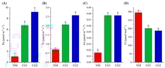 As shown in Figure 4A–D, C. geophilum promoted the photosynthesis of Massion’s pine seedlings in mining soil. Compared to NM seedlings, CG1 and CG2 treatments significantly increased the net photosynthetic rate (Pn), transpiration rate (Tr), and stomatal conductance (Gs) of Massion’s pine seedlings by 6.4–8.7 times, 1.7–3.7 times, and 3.9–4.9 times, and reduced intercellular CO2 (Ci) by 36% and 37%.