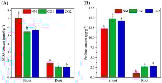 C. geophilum substantially increased proline content in shoots and roots of Massion’s pine seedlings under toxic metal stress. The content of proline in the shoot was higher than that in the root. The proline content increased significantly by 159% and 174% in roots under CG1 and CG2 treatment, while the proline content in the shoot increased by 16% and 20% (Figure 5B).