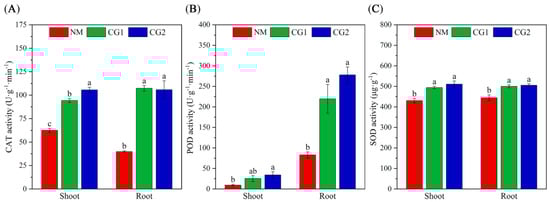 Catalase (CAT) (A), peroxidase (POD) (B), and superoxide dismutase (SOD) (C) activity in shoots and roost of non-inoculated (NM) and inoculated (CG1, CG2) Massion’s pine plants grown in toxic-metal-contaminated mine soil. Bars represent average values ± SE of 3 replicates. Different letters indicate statistically significant differences between different C. geophilum inoculations by one-way ANOVA analysis followed by Dunnett’s test (p < 0.05).