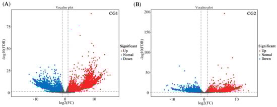 A total of 55.83 GB of clean data was obtained from the RNA-Seq analysis, with all samples achieving 4.25 GB of clean data and 94.06% of Q30 base percentages (Table S1). After assembly, a total of 38,165 unigenes were obtained, with an N50 of 2354, indicating high assembly integrity (Table S2). Fold Change ≥ 2 and FDR < 0.05 were used as screening criteria for differentially expressed genes (DEG). Volcano maps (Figure 7A,B, respectively) represent the expression of DEGs in CG1 and CG2 treatments in mine soil. Specifically, compared with NM, there were 3705 up-regulated and 4558 down-regulated DEGs under CG1 treatment. In addition, CG2 showed 4540 up-regulated and 3907 down-regulated DEGs (Figure 7). Between the CG1 and CG2 treatments, there were shared 2777 up-regulated DEGs and 2768 down-regulated DEGs (Figure 8A,B).