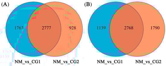 Venn diagram depicting the number of shared and specific differentially expressed genes (DEGs) induced by CG1 inoculation (NM_vs_CG1) and with CG2 inoculation (NM_vs_CG1). Up-regulated DEGs (A) and down-regulated DEGs (B). |log2Fold change| ≥ 2 and FDR < 0.05 were used as the screening criteria of DEGs. NM_vs_CG1/2 indicates: NM is the control group and CG1/2 is the experimental group.