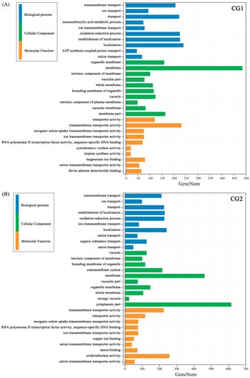 To understand the function of DEGs in Massion’s pine, a gene ontology term enrichment analysis (GO) was performed. Go enrichment analysis showed that DEGs of CG1 and CG2 treatments were enriched in some pathways of molecular function, cellular component, and biological processes (Figure 9A,B). The top GO items “transmembrane transport (GO:0055085)”, “ion transport (GO:0006811)”, “transport (GO:0006810)”, “monocarboxylic acid metabolic process (GO:0032787)”, and “oxidation reduction process (GO:0055114)”, which belonged to the biological processes, “organelle membrane (GO:0031090)”, “membrane (GO:0016020)”, and “vacuolar (GO:0005773)”, which belonged to the cellular component category, as well as “transmembrane transporter activity (GO:0022857)” and “transporter activity (GO:0005215)”, which belonged to the molecular function category, were all enriched under CG1 and CG2 treatments.