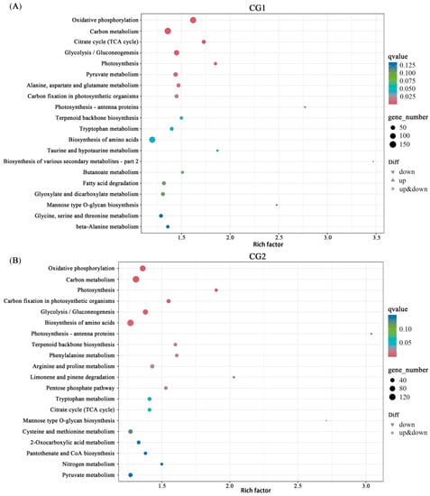KEGG enrichment of the DEGs in CG1 (A) and CG2 (B) treatments. Each symbol (circle and triangle) in the figure represents a KEGG pathway, the ordinate indicates the name of the pathway, and the abscissa is the enrichment factor. The size of the symbol represents the number of DEGs involved in the corresponding pathways.