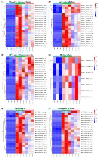 We created a heatmap of part up-regulated DEGs enriched in the same pathway to select the key genes of Massion’s pine conferring resistance to heavy metal stress mediated by C. geophilum (Figure 11). There are 78 up-regulated DEGs enriched in the common pathway of oxidative phosphorylation, 72 up-regulated DEGs enriched in carbon metabolism, 39 DEGs enriched in glycolysis/gluconeogenesis, 7 DEGs enriched in photosynthesis (Figure 11A–D), 36 up-regulated DEGs enriched in ion transport (GO:0006811), and 34 up-regulated DEGs enriched in transporter activity (GO:0005215) (Figure 11E,F).