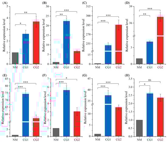 RT-qPCR analysis of the expression level of eight candidate genes in different samples. (A) TRINITY_DN81698_c0_g1, (B) TRINITY_DN156398_c0_g1, (C) TRINITY_DN22597_c0_g2, (D) TRINITY_DN40863_c0_g1, (E) TRINITY_DN55799_c0_g1, (F) TRINITY_DN4024_c0_g1, (G) TRINITY_DN74597_c0_g1, and (H) TRINITY_DN17585_c0_g1. The relative expression changes of the target gene in NM, CG1, and CG2 treatments were calculated by the 2−∆∆Ct method, and are shown as means ± SE (n = 3). The statistically significant difference between NM and CG1/CG2 treatments is tested by Student’s t-test (* p < 0.05; ** p < 0.01; *** p < 0.001, ns indicates no significant difference).