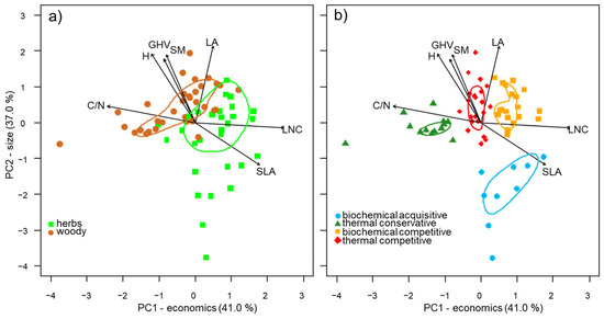 SLA and LNC were positively correlated with PC1-economics, and SM, H, and LA with PC2-size (Figure 1a, Table 1). Considering the bioenergy use indicators, C:N was negatively correlated with PC1-economics, while GHV was positively correlated with PC2-size (Figure 1a, Table 1).