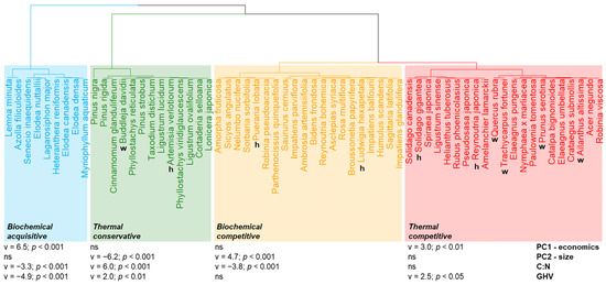 Dendrogram resulting from hierarchical clustering on the principal components (PC1-economics and PC2-size) of the invasive alien plant species (IAPS) present in the Lombardy region. Both axes contributed significantly (p < 0.001) to the clustering at k = 4, Eta2 = 0.70 and 0.77, respectively. The value of the v.test (v) and its significance (p) in the contributions to each cluster by PC1-economics, PC2-size, and by the indicators of biochemical and thermal processes (C:N and GHV) are also reported in the figure. Accordingly, classes can be grouped into biochemical-acquisitive, thermal-conservative, biochemical-competitive, and thermal-competitive. We indicated the five herbaceous (h) and five woody (w) IAPS with the highest ecological impact in Lombardy selected for the analysis of the aboveground biomass (see Table S1).