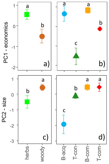 Mean values (±standard error × 1.96) of the scores of the two axes of the principal component analysis (PC1-economics and PC2-size) for different growth forms (a,c) and bioenergy use types (b,d). Results of the ANOVA are reported in each subplot; small letters indicate post hoc comparisons (p < 0.05). Legend: B-acq = biochemical acquisitive, B-com = biochemical competitive, T-con = thermal conservative, T-com = thermal competitive.