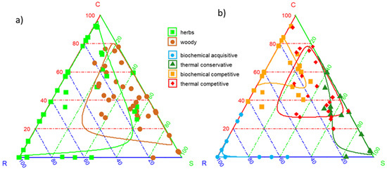 Ternary visualization of Grime’s competitive, stress-tolerant, ruderal (CSR) plant strategies of the 63 invasive alien plant species (IAPS) selected in this study, grouped by (a) growth form and (b) bioenergy use types according to the cluster they belong to (see Figure 2). Lines represent the 50th percentile of the distribution.
