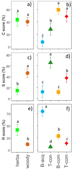 Mean values (±standard error × 1.96) of the competitive (C), stress-tolerant (S), and ruderal (R) strategy scores for different growth forms (a,c,e) and bioenergy use types (b,d,f). Results of the ANOVA are reported in each subplot; small letters indicate pos hoc comparisons (p < 0.05). Legend: B-acq = biochemical acquisitive, B-com = biochemical competitive, T-con = thermal con-servative, T-com = thermal competitive.