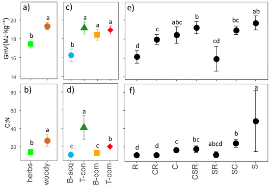 Mean values (±standard error × 1.96) of the gross heating value (GHV, above) and carbon-to-nitrogen ratio (C:N, below) scores for different growth forms (a,b), bioenergy use types (c,d), and CSR (competitive, stress-tolerant, ruderal) plant strategy types (e,f). Results of the ANOVA are reported in each subplot; small letters indicate post hoc comparisons (p < 0.05). Legend: B-acq = biochemical acquisitive, B-com = biochemical competitive, T-con = thermal con-servative, T-com = thermal competitive.
