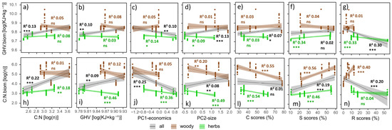 Linear regression between aboveground biomass C:N (h–n), GHV (a–g) and PC1-economics (c,j), PC2-size (d,k), C- (e,j), S- (f,m), and R- (g,n) strategy axes, and C:N (a,h) and GHV (b,i) leaf values considering the 10 selected species (all) and grouped by growth forms (herbs and woody). Legend: C:N = carbon-to-nitrogen ratio, GHV = gross heating value, PC1-economics = first principal component, PC2-size = second principal component, C = degree of competitiveness, S = degree of stress tolerance, R = degree of ruderality. The values of the linear regression coefficients are reported: determination coefficient, R2, and level of significance, p (ns = not significant, * = p ≤ 0.05, ** = p ≤ 0.01, *** = p ≤ 0.001).