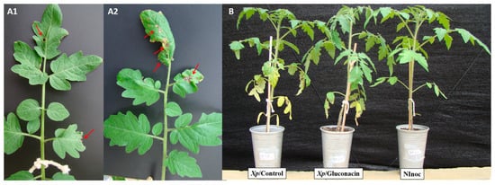Reduced symptoms of bacterial spot disease caused by X. perforans in tomato plants treated with Gluconacin (A1) or untreated (A2). The arrows indicate perforations and necrotic areas. General aspect of non-inoculated plants (Ninoc) and inoculated with the pathogen that received (Xp/Gluconacin) or no (Xp/Control) bacteriocin treatment (B).