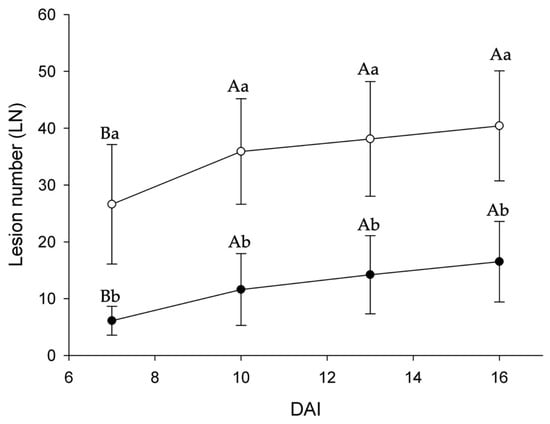 Gluconacin’s effectiveness reduced the number of lesions caused by bacterial spot disease over 16 DAI. The open dot (○) represents the control (lacking addition of Gluconacin) while the black dot (●) refers to the Gluconacin addition effect (1.0 μg·μL−1). Averages followed by identical capital letters do not differ in the DAI within each treatment. Averages followed by identical lowercase letters do not differ between treatments (control and Gluconacin). Bars represent the standard deviation.