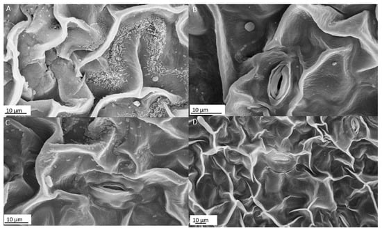 Scanning electron micrographs of tomato leaf samples from plants infected with X. perforans and untreated (A,C) or treated (B,D) with Gluconacin. The evaluations were made 24 h (A,B) and 72 h (C,D) after infection with the pathogen. The scale bars represent 10 μm.