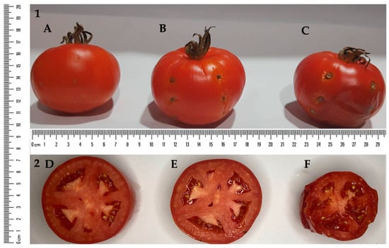 Effect of Gluconacin on tomato fruits. Disease symptoms in the fruits were assessed by visual estimation after 15 days. (1) Whole tomato fruits; (2) interior of tomato fruits, cut crosswise. (A,D), saline solution (0.85% NaCl); (B,E), elution buffer with X. perforans + Gluconacin; (C,F), elution buffer with X. perforans.