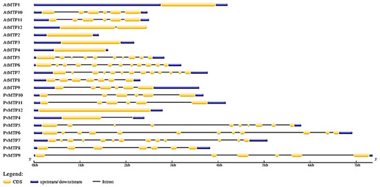 MTP gene exon/intron analysis in Arabidopsis (At) and the common bean (Pv).