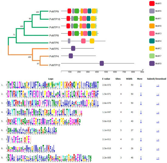 According to Gustin et al. [36], MTP sequences are divided into seven subgroups (1, 5, 6, 7, 8, 9, and 12). MTP1, MTP2, MTP3, and MTP4 are in group 1, MTP5 is in group 5, MTP6 is in group 6, MTP7 is in group 7, MTP8 is in group 8, MTP9, MTP10, and MTP11 are in group 9, and MTP12 is in group 12. It is assumed that 1, 5, and 12 groups constitute Zn-CDF, 6 and 7 groups are Fe/Zn-CDF, 8 and 9 groups are Mn-CDF [27,33]. All proteins formed the same group except for MtMTP2, which was also determined to be in group 6 in previous studies [34]. The fact that most PvMTPs belong to the group showing specificity for Mn and Zn suggests that these genes may play important roles in Mn and Zn homeostasis in common beans.