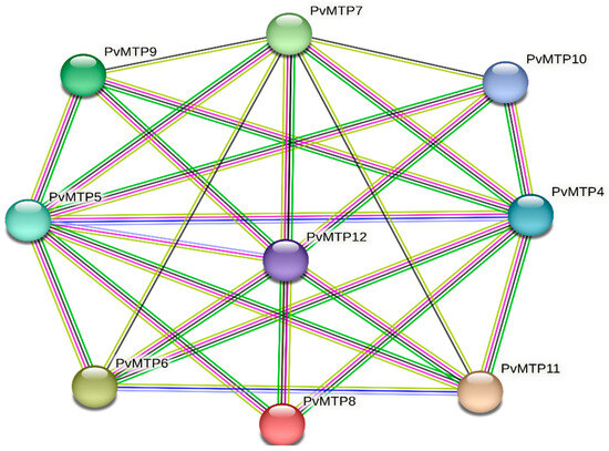 Protein—protein interaction between PvMTP family members. The type of interaction evidence is indicated by the line color (green: gene neighborhood; light blue: curated databases; pink: experimentally determined; dark blue: gene co-occurrence; yellow: text-mining; black: co-expression).