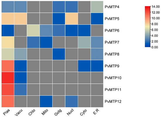 Heatmap of subcellular localization of PvMTP genes (plas: plasmid; vacu: vacuole; chlo: chloroplast; mito: mitochondria; golg: Golgi apparatus; nucl: nucleus; cyto: cytoplasm; e.r.: endoplasmic reticulum).