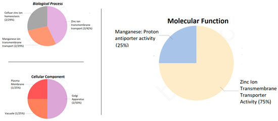 Functional analysis of the protein sequences of the PvMTP genes was performed using Blast2GO 5.2.5 (https://www.blast2go.com/ accessed on 3 December 2022), and the biological processes, molecular processes, and cellular components of nine MTP proteins were determined [42,43]. The biological processes of the PvMTP proteins were divided into three different groups: cellular zinc homeostasis (29%), zinc transfer (43%), and manganese transfer (29%). The molecular functions of the metal tolerance proteins were determined as 25% manganese activity and 75% zinc transmembrane transport activity. The cellular components were found to be 25% in the plasma membrane, 25% in the vacuole, and 50% in the Golgi apparatus (Figure 8).