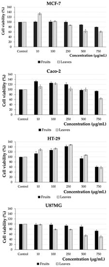 The cytotoxic effects of fruit and leaf E. japonica extracts were tested on four cancer lines (MCF-7, Caco-2, HT-29, and U87MG) by means of the MTS test. Cells were treated for 48 h with increasing doses of the extracts (10–750 µg/mL). Untreated cells as well as cells treated with ethanol at concentrations of 0.006–0.45% were used as controls (see Figure S1). The results of the tests are presented in Figure 1.