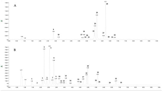 Photodiode Array (PDA) chromatogram of Eriobotrya japonica fruit (A) and leaf (B) extracts recorded at the wavelength of 350 nm. Peak data are shown in Table 5.