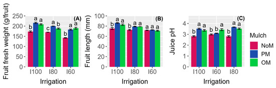 Effect of the irrigation and mulching treatments on the (A) fruit fresh weight, (B) fruit length, and (C) juice pH at harvest. Within each panel and separately for each irrigation treatment, means followed by a common letter are not significantly different according to the Tukey test (p ≤ 0.05).