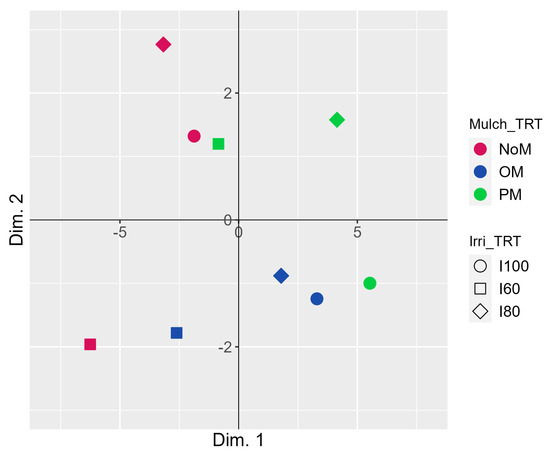 Experimental treatments are rather uniformly distributed in all quadrants, suggesting a diverse response across the conditions under investigation. This implies that the variation observed in the data is relatively homogeneous and not strongly influenced by a single treatment (irrigation and mulching). Moreover, the absence of clear clustering (e.g., according to each factor and their levels) indicates that both irrigation and mulching treatments are significant in contributing to the observed variations. The distribution patterns on the PCA plot also provide interesting information. The NoM treatment appears to be primarily separated along Dimension 2, while the OM treatment shows separation along Dimension 1. The dominant separation along either axis suggests that different associated variables (Table S1) have a stronger influence on the observed variations for mulching. In the case of the third mulching type (PM), separation is observed along both axes, indicating that with plastic mulch, the variability in the dataset is not primarily driven by one specific variable or factor. Finally, the observation that I100, the fully irrigated treatment, does not exhibit a large influence on the two mulching types aligns with the notion that the impact of the kind of mulching is not as pronounced in the full irrigation regime, and strong differences are relative to the absence of mulching.