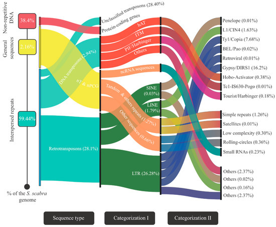 - Flynn, J.M.; Hubley, R.; Goubert, C.; Rosen, J.; Clark, A.G.; Feschotte, C.; Smit, A.F. RepeatModeler2 for automated genomic discovery of transposable element families. Proc. Natl. Acad. Sci. USA 2020, 117, 9451–9457. [Google Scholar] [CrossRef] [PubMed]