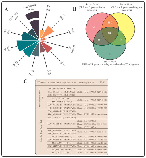 3.3. Identification of S. scabra Immune Receptors and Anchoring Analysis in Soybean QTLs Associated with Resistance to Asian Soybean Rust