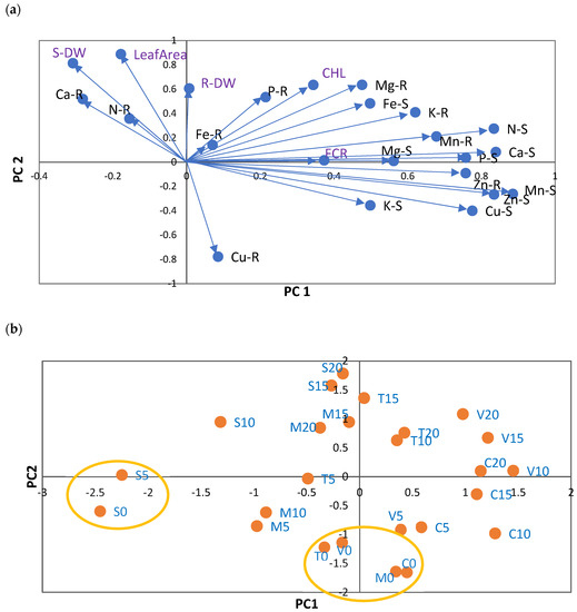 (a) Principal component analysis of nutrient concentrations (in mg g−1 DW: N, P, K, Ca, and Mg; in µg g−1: DW: Fe, Cu, Zn, and Mn) in shoots (S) and roots (R) of five citrus rootstocks. PC1—first principal component; PC2—second principal component. Each vector represents the loadings of variables (nutrients and Fe chlorosis parameters: CHL, leaf area, S-DW, R-DW, and FCR) in each principal component. Loadings represent the relative contribution of each nutrient to that component. Concentration of nutrients in shoots (S) and roots (R): N (N-S and N-R), P (P-S and P-R), K (K-S and K-R), Ca (Ca-S and Ca-R), Mg (Mg-S and Mg-R), Cu (Cu-S and Cu-R), Fe (Fe-S and Fe-R), Mn (Mn-S and Mn-R), and Zn (Zn-S and Zn-R). (b) Projection of 25 scores resulting from 5 rootstocks (S —sour orange, V—Volkamer lemon, T—Toyer citrange, C—Carrizo citrange and M—C. macrophylla) × 5 Fe levels (0, 5, 10, 15, and 20 µM of Fe) onto the plane defined by the principal components. The labels of treatments result from the combination of the letter associated with each rootstock and the concentration of Fe in nutrient solution.