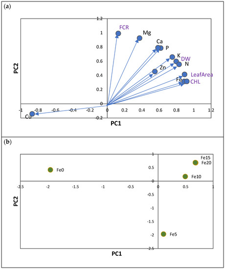 (a) Principal component analysis of nutrient contents (in mg: N, P, K, Ca, and Mg; and in µg: Fe, Cu, Zn, and Mn) of five citrus rootstocks considering the total in plants (roots plus shoots). PC1—first principal component; PC2—second principal component. Each vector represents the loadings of variables (nutrients and Fe chlorosis parameters: CHL, leaf area, S-DW, R-DW, and FCR) in each principal component. Loadings represent the relative contribution of each nutrient to that component. (b) Projection of 5 Fe levels (0, 5, 10, 15, and 20 µM of Fe) considering all rootstocks.