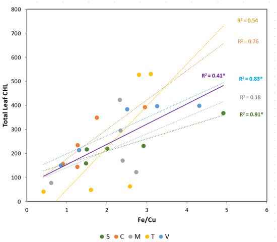 Linear regression relationships between total leaf CHL (µmol m−2) and total Fe/Cu ratio for each rootstock (circles) and considering all treatments together (purple line). Treatments are 5 rootstocks (S—sour orange, V—Volkamer lemon, T—Toyer citrange, C—Carrizo citrange and M—C. macrophylla) × 5 Fe levels (0, 5, 10, 15, and 20 µM of Fe). The coefficient of determination (R2) is presented for each model and significant models (p < 0.05) are indicated by one asterisk (*).