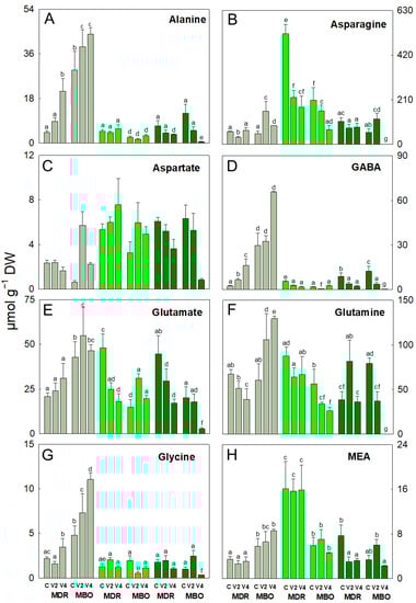 Alanine (A), asparagine (B), aspartate (C), γ-aminobutyric acid (GABA, (D)), glutamate (E), glutamine (F), glycine (G), and monoethanolamine (MEA, (H)) expressed as µmol g −1 DW in plants of Ranunculus asiaticus L. hybrids MDR and MBO, obtained by three vernalization procedures of tuberous roots: only rehydration (Control, (C)), rehydration plus vernalization for 2 weeks (V2), and rehydration plus vernalization for 4 weeks (V4), throughout the growing cycle, in different plant stages, pre-planting (greyish), vegetative phase (light green), and flowering (dark green). All data are expressed as mean ± SD, n = 3. Different letters indicate significant differences (p ≤ 0.05).