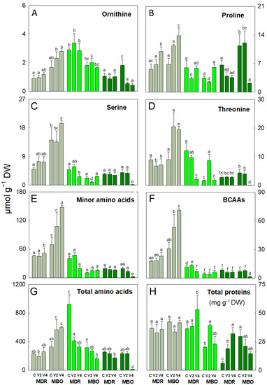 The content of minor amino acids (including arginine, histidine, isoleucine, leucine, lysine, methionine, phenylalanine, tyrosine, tryptophan, and valine) was influenced by V and H × V (Supplemental Table S1). In fact, they increased in the pre-planting stage, in particular in both hybrids under V4 (+136% and 230%, respectively; Figure 2E). Minor amino acids also increased in the vegetative stage in MBO V2 and V4 (+48% and +51%, respectively) compared to controls. The branched-chain amino acids (BCAAs, including isoleucine, leucine, and valine) showed changes in all growth stages. BCAAs increased in pre-planting in MBO V4 (+291%) and in the vegetative phase in MDR V2 (+12%) compared to control (Figure 2F). On the contrary, these amino acids decreased during vegetative growth in MDR V4 (−40%) and only at the flowering stage in MBO V4 (−78%), compared to respective controls (Figure 2F).