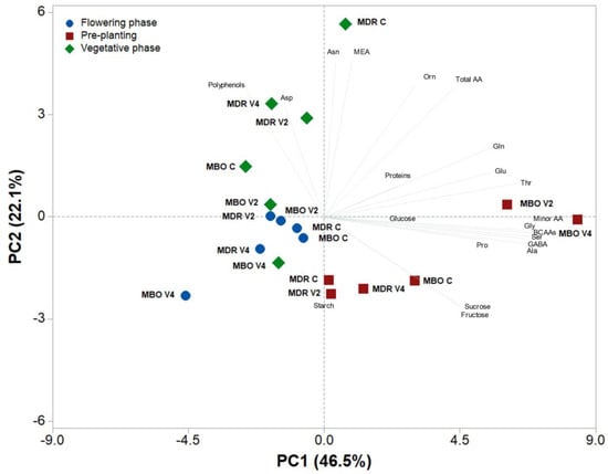 Principal component loading plot and scores of principal component analysis (PCA) of carbohydrates, amino acids, polyphenols, and soluble proteins in roots of Ranunculus asiaticus L. hybrids MDR and MBO, obtained by three vernalization procedures of tuberous roots: only rehydration (Control, C), rehydration plus vernalization for 2 weeks (V2), and rehydration plus vernalization for 4 weeks (V4), throughout the growing cycle, in different plant stages (pre-planting, vegetative phase, and flowering).