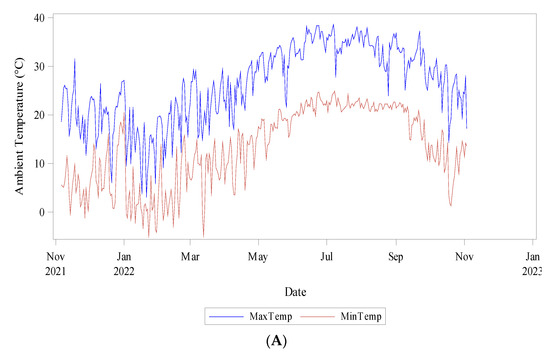 Climatic conditions during data collection (Nov 2021–Nov 2022) (A) Ambient Temperature (°C) minimum and maximum, (B) Relative humidity (%), and (C) Soil Temperature (°C) and Water Content (m3/m3).