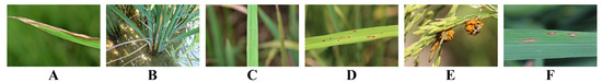 Illustration of the image dataset used in this paper. (A) represents white leaf blight; (B) represents brown spot disease; (C) represents bacterial stripe disease; (D) represents sesame leaf spot disease; (E) represents rice aspergillosis disease; (F) represents rice blast disease.