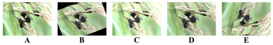 Illustration of the different image augmentation methods used in this paper. (A) represents contrast augmentation; (B) represents rotation augmentation; (C) represents brightness augmentation; (D) represents cropping augmentation; (E) represents flipping augmentation.
