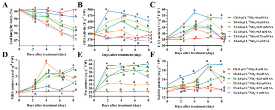 The external morphology of a plant can provide insight into how well it is adapting to its environment. This is typically mirrored by changes in the active substances and metabolic activities within the plant. The leaf integrity index is an indicator for quantitatively evaluating the degree of leaf area damage. Throughout the 8-day stress experiment, the leaf integrity index displayed a decreasing trend over time in all the treatment groups, excluding the control group (CK). During the 8-day stress period, all the treatment groups, with the exception of CK, exhibited a decreasing trend over time in the leaf integrity index (Figure 1A); however, the 1 mM (T4), 0.75 mM (T3), 0.5 mM (T2), and 0.25 mM (T1) treatments showed significantly higher values than the pure NO2 stress group (T0).