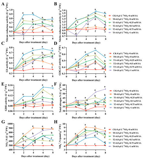 The effect of different concentrations of SA treatment on the nitrogen metabolism enzyme activity and nitrogen abundance in different forms of B. × buttiana ‘Miss Manila’. (A) Nitrate reductase (NR) activity. (B) Nitrite reductase (NiR) activity. (C) Glutamine synthetase (GS) activity. (D) Glutamine-α-oxoglutarate aminotransferase (GOGAT) activity. (E) Glutamate dehydrogenase (GDH) activity. (F) Total nitrogen. (G) Nitrate nitrogen (NO3−-N). (H) Ammonium nitrogen (NH4+-N).
