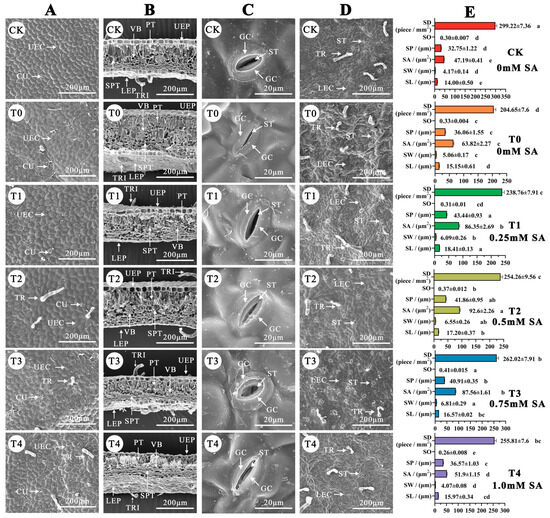 In the SA treatment groups (ordered from T3 to T2, T1, and T4), the arrangement of the leaf epidermis gradually decreased. The degree of cuticle dehiscence progressively worsened; however, the leaf fenestrations and spongy tissues were more stable and uniformly arranged than in the T0 group. The vascular bundle deformation degree was low, and the stomatal openness had a notable increase, despite a decrease in the degree of opening and closing (Figure 4E).