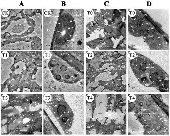 Plant cells undergo morphological transformations in response to adversity stress, and this impacts the structure of the organelles accordingly. After 8 days, the CK cells exhibited structural stability, with a clear cell framework and intact cytoplasm and cell membranes (Figure 5A). There was a low number of plastids, full starch granules in chloroplasts, an intact inner membrane, clearly visible stroma and cystoid, neatly arranged cystoid basal granules at moderate distances, and few osmiophilic granules (Figure 5B).