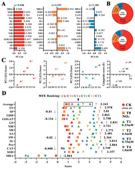 The 14 extracted indicators were standardized and subjected to PCA (Figure 7). Except for CK, all the treatments can be roughly divided into two categories: 1 mM SA and pure NO2 stress (T0) belong to one category, and 0.25–0.75 mM SA (T1-T3) belong to the other category (Figure 7A). There was a significant difference in T0 between CK and the pure stress groups in the control group (Figure 7B). Within SA, 0.25–0.75 mM had more scattered points in the first principal component (PC1), and the treatment of 0.75 mM (T3) was the most significant, while the concentration of 1.0 mM SA (T4) was significantly different from the other three concentrations (Figure 7). This demonstrates the significant difference between the 0.75 mM and 1.0 mM treatments and T0 (Figure 7D). In addition, PCA specifically accounted for 95.895% of the variance in the data (>85%) of the 14 indicators. Three principal components (PC1, PC2, and PC3) with eigenvalues >1 were extracted, with respective eigenvalues of 9.948, 2.293, and 1.184 (Figure 8A). The variance contributions of these components were 71.059%, 16.382%, and 8.455%, respectively (Figure 8B).