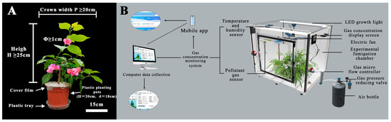 Experimental plant materials and fumigation test equipment. (A) Bougainvillea × buttiana ‘Miss Manila’ (2-year-old cutting seedling). Scale bar = 15 cm. (B) Schematic diagram of NO2 fumigation test device.