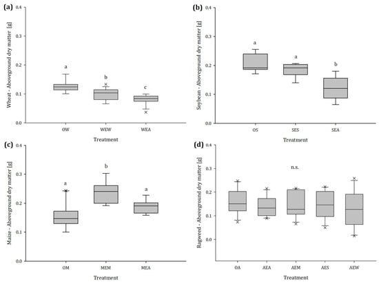 Aboveground dry mass of (a) wheat, (b) soybean, (c) maize, and (d) ragweed in dependence of the emitting plant species, n = 14; different letters indicate significant differences, n.s. no statistically significant differences were detected among treatments. Abbreviations: OW = unexposed wheat, WEW = wheat exposed to wheat, WEA = wheat exposed to ragweed, OS = unexposed soybean, SES = soybean exposed to soybean, SEA = soybean exposed to ragweed, OM = unexposed maize, MEM = maize exposed to maize, MEA = maize exposed to ragweed, OA = unexposed ragweed, AEA = ragweed exposed to ragweed, AEM = ragweed exposed to maize, AES = ragweed exposed to soybean, AEW = ragweed exposed to wheat.