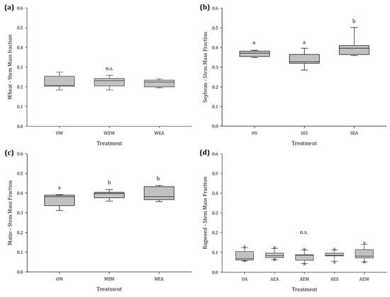 Stem mass fraction of (a) wheat, (b) soybean, (c) maize, and (d) ragweed in dependence of the emitting plant species, n = 14; different letters indicate significant differences, n.s. no statistically significant differences were detected among treatments. Abbreviations: OW = unexposed wheat, WEW = wheat exposed to wheat, WEA = wheat exposed to ragweed, OS = unexposed soybean, SES = soybean exposed to soybean, SEA = soybean exposed to ragweed, OM = unexposed maize, MEM = maize exposed to maize, MEA = maize exposed to ragweed, OA = unexposed ragweed, AEA = ragweed exposed to ragweed, AEM = ragweed exposed to maize, AES = ragweed exposed to soybean, AEW = ragweed exposed to wheat.