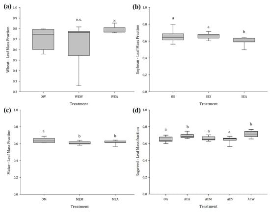 Leaf mass fraction of (a) wheat, (b) soybean, (c) maize, and (d) ragweed in dependence of the emitting plant species, n = 14; different letters indicate significant differences, n.s. no statistically significant differences were detected among treatments. Abbreviations: OW = unexposed wheat, WEW = wheat exposed to wheat, WEA = wheat exposed to ragweed, OS = unexposed soybean, SES = soybean exposed to soybean, SEA = soybean exposed to ragweed, OM = unexposed maize, MEM = maize exposed to maize, MEA = maize exposed to ragweed, OA = unexposed ragweed, AEA = ragweed exposed to ragweed, AEM = ragweed exposed to maize, AES = ragweed exposed to soybean, AEW = ragweed exposed to wheat.