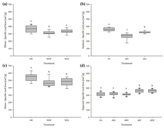 Specific leaf area of (a) wheat, (b) soybean, (c) maize, and (d) ragweed in dependence of the emitting plant species, n = 14; different letters indicate significant differences. Abbreviations: OW = unexposed wheat, WEW = wheat exposed to wheat, WEA = wheat exposed to ragweed, OS = unexposed soybean, SES = soybean exposed to soybean, SEA = soybean exposed to ragweed, OM = unexposed maize, MEM = maize exposed to maize, MEA = maize exposed to ragweed, OA = unexposed ragweed, AEA = ragweed exposed to ragweed, AEM = ragweed exposed to maize, AES = ragweed exposed to soybean, AEW = ragweed exposed to wheat.